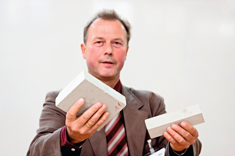 Die Ergebnisse der dreijährigen Forschungsarbeit „ALEKOM“ – einem Gemeinschaftsprojekt der BTU und der Dr. Krakow Rohstoffconsult Göttingen – stellte Prof. Dr. rer. nat., Dr.-Ing. habil. Klaus-Jürgen Hünger (Bild 2) von der Brandenburgischen Technischen Universität Cottbus vor. Inzwischen sei es hier gelungen, neben kleinteiligen Bauelementen auch Probekörper im „Ziegelformat“ herzustellen. Ziel des Projekts ist die Herstellung von kleinformatigen Bau-/Formteilen auf Basis eines aschegebundenen Feinkornsystems. Entscheidend sei hier aus ökologischer Sicht, dass dabei auf einen Brennprozess verzichtet werden kann. Die Festigkeit der Formteile entstehe bei der Trocknung schon bei Lufttemperaturen von 20 °C über eine Ettringitbildung in dem Asche-Ton-Gemisch, so Prof. Hünger. 28 Tage nach der Herstellung konnten Festigkeiten von über 10 N/mm2 erreicht werden. Die Umweltverträglichkeit für den Einbau in technische Bauwerke sei nachgewiesen. Derzeit würde eine Optimierung der Mischungen aus verschiedenen Aschen unter chemisch-mineralogischen und granulometrischen Gesichtspunkten durchgeführt. Dabei sollen die Gefügeeigenschaften, die Sulfatbindung in den Aschen und die Gefügestabilität bei intensivem Wasserkontakt weiter verbessert werden. Zudem wird für Nutzungsvarianten mit intensivem Wasserkontakt außerhalb von technischen Bauwerken an der Umweltverträglichkeit des aschegebundenen Feinkornsystems weiter gearbeitet.