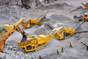 Ein Teil des Treffens bestand darin, fahrbare Brecher und Siebe in einem nahegelegenen Granitbruch in Aktion zu sehen (Bild 1). Präsentiert wurden einige Backenbrecher von Keestrack und OMTRACK zusammen mit unterschiedlichen Sieben und Grobsieben von Keestrack. Der kleinste Brecher bei der Vorführung war der Verkaufsschlager der Gruppe, der raupenfahrbare Brecher Argo, ein Backenbrecher von 1000 mm x 600 mm mit einem Gewicht von ca. 30 t. Es folgte sein neu entwickelter Bruder namens Cruiser, ein Backenbrecher von 1000 x 600 mm und einem Gewicht von 36 t einschließlich eines Doppeldeck-Vorsiebs, sowie der größere Bruder namens Giove, ein Backenbrecher von 1100 x 750 mm und einem Gewicht von 47 t, der ebenfalls mit einem Doppeldeck-Vorsieb ausgerüstet ist. Diese Hochleistungsbrecher sind mit dem patentierten Non-Stop-System (N.S.S.) von OMTRACK ausgerüstet. Dieses System schützt den Brecher vor nicht brechbarem Material, indem die Austragsspaltweite geöffnet wird, um das Material durchzulassen. Danach wird die ursprüngliche Spaltweite automatisch wieder eingestellt, ohne den Brecher anzuhalten.