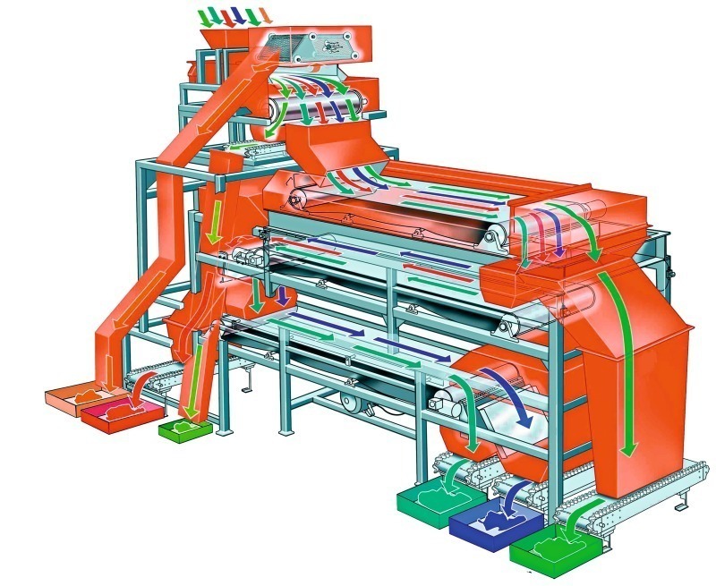 Das Material wird der Anlage über einen Rüttelaufgeber aufgegeben. In Abhängigkeit von den Sortiertechniken auf den jeweiligen Sortierdecks wird das Material von oben nach unten in die gewünschten Fraktionen aufgegliedert. Anwendbare Sortiertechniken arbeiten z.B. mit Magneten, Wirbelstrom, Induktionssensoren, optischen Sensoren bzw. einer Kombination daraus. Der Materialauswurf kann durch Druckluft oder ein mechanisches System erfolgen. Die Kombination der verschiedenen Sortiersysteme minimiert Raumbedarf, Kosten, Energie und bietet bestmögliche Sortierergebnisse.
