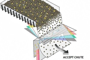Bild 5 zeigt das Funktionsprinzip der Lasersortierung. Der Aufgaberüttler verteilt das Produkt gleichmäßig über die Freifallschurre. Das Produkt fällt nach unten in den Inspektionsbereich, wo mehrere Laserstrahlen die gesamte Breite des herunterfallenden Produktstroms scannen.