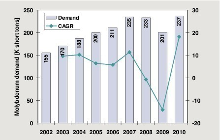 Molybdän, das für die Herstellung von Edelstahl erforderlich ist, wurde im Jahre 2010 in den USA in acht Minen produziert. Mit einer Produktion von 56 000 Tonnen nimmt man hinter China (94 000 Tonnen) im weltweiten Maßstab den 2. Platz ein und kommt auf 24 % der Weltförderung. Die übrigen wichtigen Förderländer sind Chile, Peru, Kanada und Mexiko. Nach stagnierenden Verbräuchen bis zum Jahre 2002 ist der Molybdän-Verbrauch sprunghaft gestiegen (Bild 17). Allerdings haben die Weltwirtschaftskrise und der sinkende Edelstahlverbrauch zuletzt zu deutlichen Einbrüchen geführt. 2010 war jedoch ein neuer Peak. Der größte Anstieg erfolgte von 2009 auf 2010 mit fast 25 % in China auf 74 300 Tonnen (short tons). Die USA verbrauchten 33 800 Tonnen (short tons).