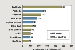 Auf den weiteren Plätzen innerhalb der TOP 5 folgen mit Cloud Peak Energy (91 MST), Alpha Natural Resources (83,5 MST) und Consol Energy (58 MST) Unternehmen mit Produktionsmengen von 50 bis 100 MST. Alpha ist durch die Übernahme von Massey Energy auf 124 MST angewachsen. Auch im internationalen Vergleich nehmen die US-Firmen führende Plätze ein (Bild 5). Vier der Unternehmen befinden sich in den globalen TOP 10. Die Zeichen der führenden US-Firmen sind auf Wachstum gesetzt. Peabody besitzt neben den Minen in den USA Betriebe in Australien, Indonesien, China und die Mongolei. War man bis 2003 noch fast ausschließlich auf amerikanischen Territorium, so sind in 2011 53 % der Kapazitäten außerhalb der USA vorhanden. Etwa 100 MST Wachstum wird bei Peabody bis 2015 allein in asiatischen Ländern erfolgen.