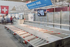 Das Highlight am FRUTIGER Stand war die Weltneuheit MobyDick® ONE. Durch das innovative Design sind unter Einschluss der bewährten Palette an optional einsetzbarem Zubehör nun weitere Funktionen möglich, die die Reinigungskraft nochmals erhöhen und das Problem der verschmutzten öffentlichen Straßen durch Bau- und andere Fahrzeuge nachhaltig lösen. Daran haben nicht zuletzt die erweiterten Standardlängen bis zu 20 m einen großen Anteil. Aber auch die veränderten Fahrprofile und Düsenstellung, die Innovation der jederzeit wechselbaren modularen Seiten- und Bodendüsen sowie die in Zusammenarbeit mit der Eidgenössischen Technischen Hochschule Zürich (ETH) entwickelte strömungsoptimierte Geometrie der Waschmodule konnten überzeugen. Nun ist es möglich, dass auch Kettenfahrzeuge auf der Anlage gewaschen werden können.