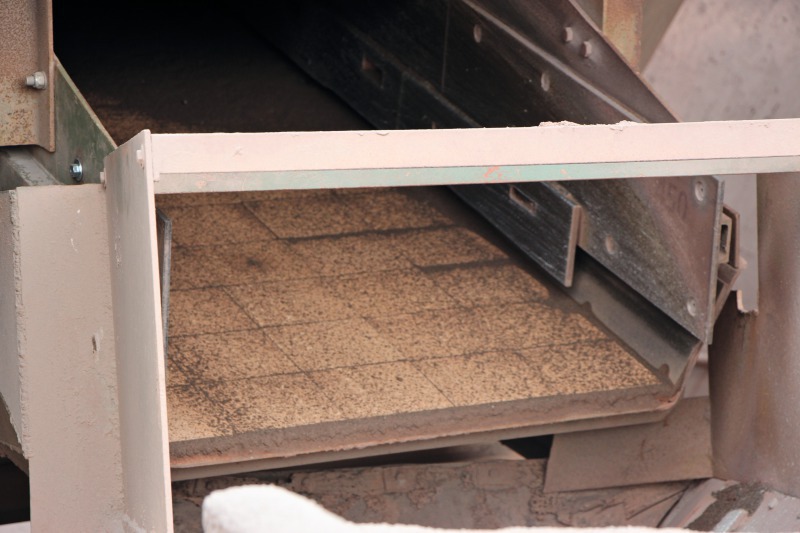 Bei der in dieser Anlage zu erwartendem Verschleiß, ist auch die einfache Wechselmöglichkeit der Verschleißschutzelemente von großem Vorteil. Sämtliche Platten sind mit nur einer Schraube befestigt. Lediglich die 300 x 250 mm großen Platten im Aufgabebereich sind mit 3 Schrauben befestigt. Bei ungleichmäßigem Verschleiß können jeweils kleinflächig die verschlissenen Elemente ausgewechselt werden.