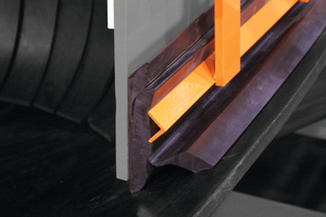 Bild 4 zeigt, dass bei der Bestimmung der Sockelbreite WS mehr als nur die freie Riemenkante berücksichtigt werden muss. Es wird allgemein angenommen, dass WS das Innenmaß der Sockelleistenstege ist. Wenn die Verschleißauskleidung eine beträchtliche Dicke aufweist, wie z. B. Gusseisen oder Gummiblöcke, sollte die Dicke der Verschleißauskleidung bei der Festlegung des Abstandes der Sockelleiste berücksichtigt werden, da sie sich auf die Förderleistung auswirkt. Die Ausführungen der Dichtungssysteme variieren erheblich, so dass der angemessene Randabstand in der Lastzone von den tatsächlichen Abmessungen des angegebenen Dichtungssystems abhängt.
