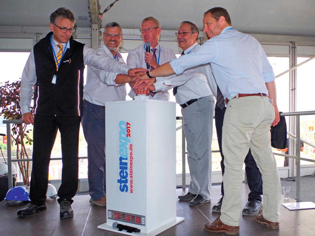 2 Gemeinsam stark – Die gemeinsame Eröffnung der steinexpo mit allen Partnern per Buzzer hat mittlerweile schon Tradition. Dieses Jahr dann mit noch mehr „helfenden Händen“ und neuen Gesichtern