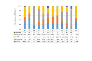 Um ihrer Vorreiterrolle gerecht zu werden, muss die EU in erster Linie die Deponierung von Siedlungsabfällen eindämmen und in den betroffenen Ländern in Technologien und Anlagen zum Recycling investieren. Bild 7 zeigt für die oben genannten Länder eine Aufteilung der Siedlungsabfallmengen nach Behandlungsarten. Auffallend sind die hohen Deponieanteile in Ländern wie Griechenland, Rumänien, Polen und Portugal und außerdem die Deponieanteile in Spanien, Frankreich und Italien. Auch die Anteile der unbehandelten Abfälle in Italien, Rumänien und Portugal sind alarmierend. Man kann wohl davon ausgehen, dass es sich bei diesen Mengen um illegale Deponien handelt. Die tatsächlichen Recyclingmengen bewegen sich im Vergleich dazu eher auf einem niedrigen Level.