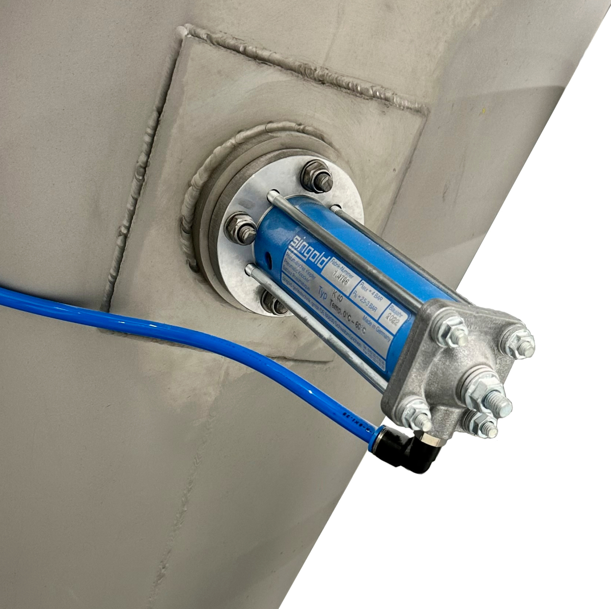 Gesteuert wird der Klopfer üblicherweise elektrisch über ein Magnetventil. Für wechselnde Container und sich langsam drehende Trommeln sowie für heiße Wände bietet die singold gerätetechnik gmbh eine spezielle Lösung an: den Distanz-Klopfer, bei dem die Kolbenstange einen Abstand zwischen Klopfer und Behälter überbrückt.