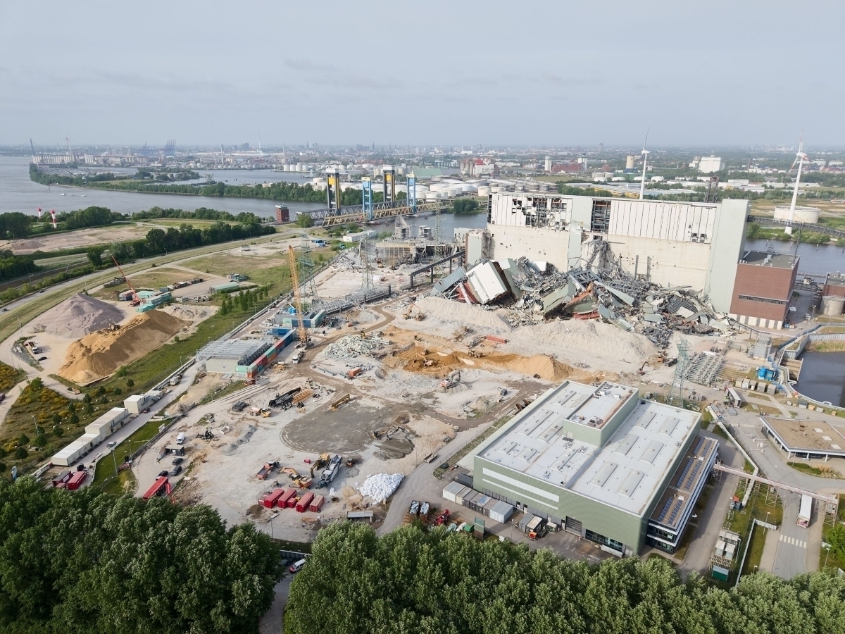 15.09.2025Ende März dieses Jahres sollten die beiden rund 24 000 Tonnen schweren Kesselhäuser eines der größten Steinkohlekraftwerke Europas an der Süderelbe in Hamburg durch eine Sprengung zu Fall gebracht werden. Die Fallrichtungssprengung mit Kipprichtung nach Westen war zuvor wochenlang intensiv vorbereitet worden. Wie bereits bei der Sprengung der Kamine im November 2024 kam auch hier das bewährte Verfahren der Wasservollraumsprengung zum Einsatz. Dafür wurden die Stützen der Kesselhäuser mit Wasser befüllt und jeweils mit Ladungen bestückt. Doch zunächst ging eines der beiden baugleichen Kesselhäuser aufgrund einer Fehlsprengung nicht zu Boden. Die Folge: Ein Rückbau-Ersatzkonzept war nötig, das die Hagedorn Unternehmensgruppe gemeinsam mit den zuständigen Behörden und dem Auftraggeber entwickelte und mit Unterstützung von Zeppelin in Rekordtempo umsetzte.