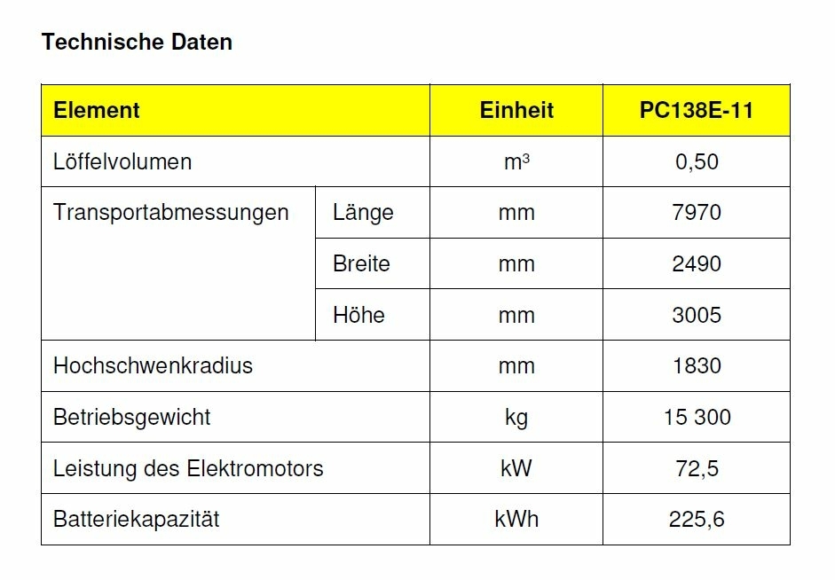 Neuer 13-t-Elektrobaggers PC138E-11 mit Lithium-Ionen-Batterie