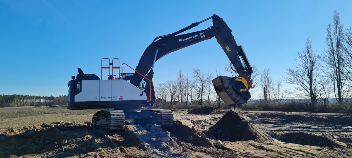 Die Frauenrath Unternehmensguppe aus dem Rheinländischen Heinsberg ist ein seit über 150 Jahren überregional tätiges Unternehmen in den Bereichen Bau, BauConcept, Landschaftsbau und Recycling. In Großröhrsdorf / Sachsen unterhält man nicht nur eine eigene Niederlassung, sondern auch ein großes Recyclingzentrum, wo sich der Maschinenpark jetzt um einen mobilen Brecherlöffel, aus dem Hause MB Crusher, erweitert hat.