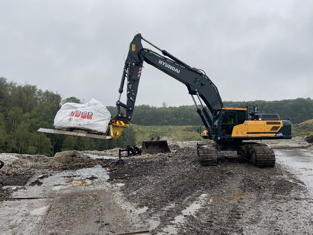 Der Hyundai HX520 AL lagert BigBags mit Recycligmaterial auf einer Attero-Deponie in Landgraaf