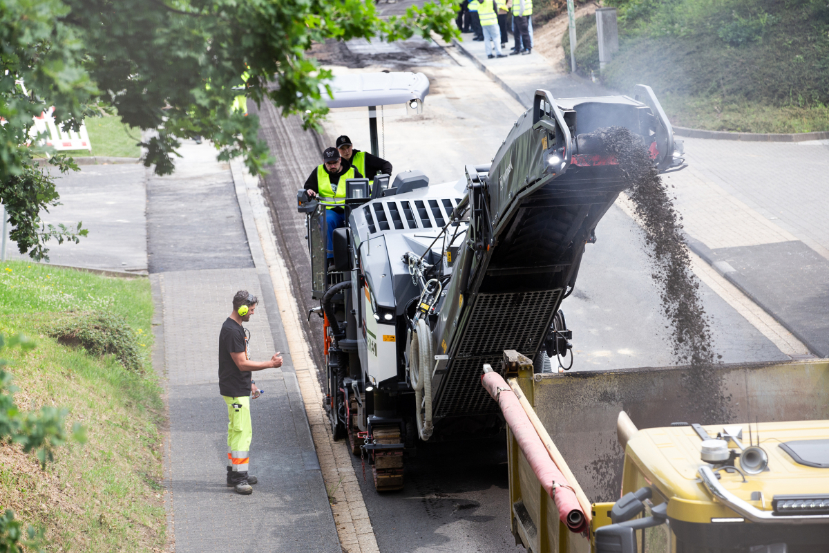 Am ersten Tag frästen die Auszubildenden mit einer W 120 Fi und W 50 Ri den 450 m langen und 5 m breiten Straßenbelag an der Hallerbacher Straße ab