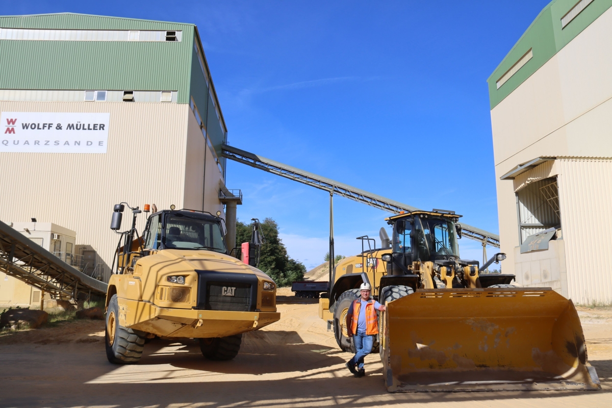 Seit 2001 gehört das Werk Quedlinburg zur Wolff & Müller Holding. „Die Produktion wurde stetig erweitert und verfeinert“, so Holger Gille, verantwortlicher Werkleiter. Dafür sorgt eine Sandveredelungsanlage. Hinzu kam eine Wasch- und Klassieranlage und es folgte die Investition in ein zweites Trocknungswerk. Auch die für die Gewinnung mineralischer Rohstoffe nötige Baumaschinentechnik wurde kontinuierlich an die Anforderungen angepasst – das zeigt ein neuer Cat Radlader 980 XE, der zum grünen Fußabdruck beiträgt.