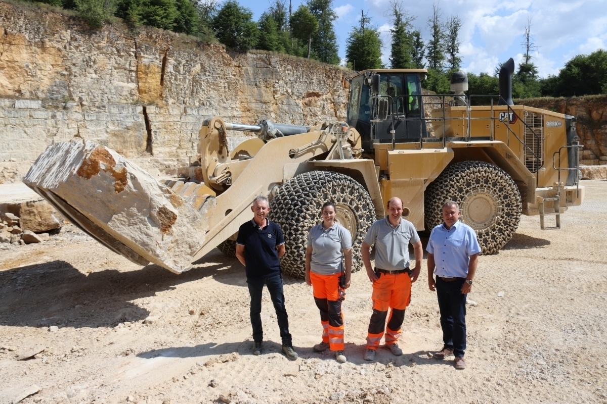 Gesetzt war in dem Unternehmen all die Jahre ein Radlader in der Größe eines Cat 988. Seit 1993 arbeitet Karl Schwenk in diesem Unternehmen als Radladerfahrer – angefangen hat er mit der B-Serie. Es folgten die Serien F, H und K. Inzwischen ist er beim Cat 988K XE angekommen. Er hat das richtige Gespür dafür, wie er die im Lauf von Millionen Jahren mit den Schichten verwachsenen Blöcke herausholt. „Da braucht es viel Gefühl. Oft lassen sich die Blöcke nur schlecht von der dazwischenliegenden Lehmschicht lösen. Aber Karl ist die treue Seele unseres Betriebs. Er kennt jede Lage in unserem Steinbruch und weiß ganz genau, wie er vorgehen muss, damit wir möglichst wenig Ausschuss haben“, meint Ludwig Wenninger. Und das wird oftmals zu einem ganz schönen Kraftakt.