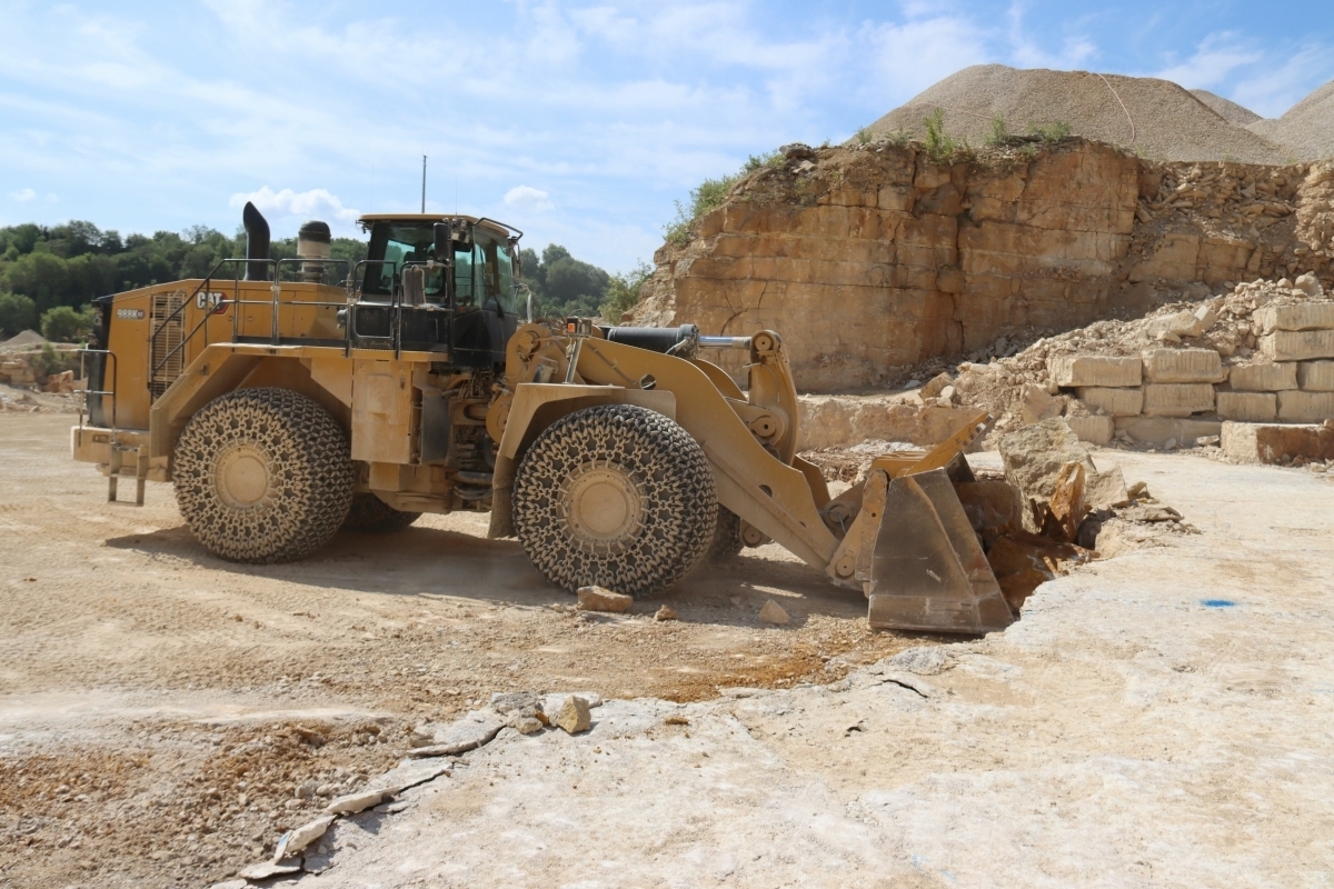 Ein Cat Kettenbagger 326FLN in Verbindung mit einem Wimmer Anbaugerät hat wiederum die Aufgaben eines Bohrgeräts übernommen, das vertikal Löcher in den Gesteinsschichten anlegt. In diese Löcher werden Hydraulikspalter eingesetzt, die mit Druck den mächtigen Naturstein aus dem festen Verbund ablösen – tiefe Risse treten auf. Dann kommt der Cat Radlader 988K XE ins Spiel und schiebt seinen Hebezahn unter den Block und bricht ihn heraus. Schicht für Schicht und Block für Block werden getrennt. Deren Größe hängt von den natürlichen Klüften und Spalten sowie Schichtdicken ab. Doch mit dem Lösen der Blöcke ist es damit noch nicht getan – ein Block kann schon mal 20 t und mehr Ladung aufbringen. So ein schwerer Klotz muss transportiert und verladen werden. Für diese Aufgabe tauscht der Fahrer den Hebezahn gegen Gabelzinken aus. Mit einer Schaufel werden Gesteinsbrocken und Reste aufgenommen, die dann der Schotterproduktion zugeführt werden.