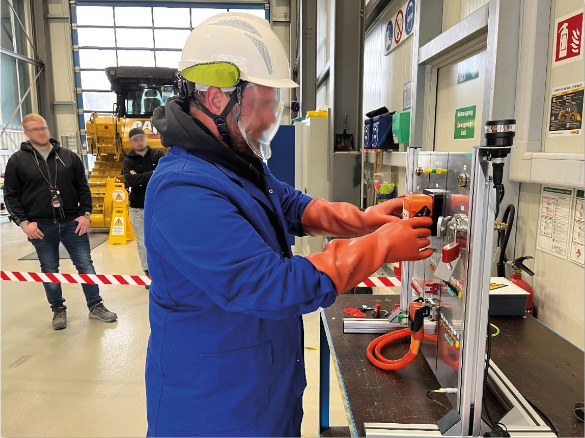 Mit dem Beginn der Einführung von Cat Baumaschinen mit Hochvolt-System vor einigen Jahren musste Zeppelin bereits die nötigen Voraussetzungen für Arbeiten im Service schaffen. „Begonnen haben wir mit der Ausbildung zur Elektrofachkraft für festgelegte Tätigkeiten (EFffT) vor über zehn Jahren, die dann 2020 in die FHV-Ausbildung überging. Diese Grundlagenausbildung ist Grundvoraussetzung dafür, dass unsere Servicetechniker verschiedene Arbeiten an batterie- oder dieselelektrischen Maschinen durchführen können“, so Markus Spiegl, der das Schulungszentrum Kaufbeuren leitet. Doch dafür ist auch entsprechende Ausrüstung erforderlich. „Verwendet werden darf ausschließlich isoliertes und zertifiziertes Werkzeug, das für Geräte mit tausend Volt Spannungsquelle zugelassen ist. Hinzu kommt spezielle Schutzkleidung, die sicher vor Störlichtbögen ist. Mitarbeiter müssen einen Helm mit Visier sowie besondere Gummihandschuhe tragen, die ebenfalls für tausend Volt Spannung ausgelegt sind“, so Kathrin Kühn.