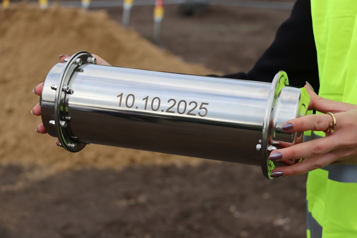 In die Zeitkapsel, die einbetoniert wird, kamen Baupläne, ein Cat Modell, ein Schraubenschlüssel für den Service sowie eine aktuelle Ausgabe der Zeitung Baublatt