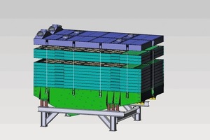 The product is distributed by means of a distributor system in the feed area combined with an upstream feeding system (e.g. fluted roll feeder). On the discharge side, the fractions are collected in modified collecting hoppers. The drive (unbalance) motors installed at the bottom are fitted, depending on the height of the screen blocks, at a work angle of around 35-40° (Fig. 2). The inserted screening panels made of wood, lightweight metal or plastic, have modular dimensions of around 800 x 800 mm and can be individually removed and replaced. Screening surfaces from 1.0 x 2.0 to (4) x 1.0 x 4.0 can therefore be realized. The screening surfaces can be combined with various cleaning aids depending on the applications. The screening surfaces are clamped into the holder frames (light metal sections) mechanically with spindle-type tensioners or hydraulically by means of cylinders.