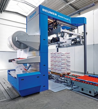Packaged items stacked accurately on pallets can then be transported successfully to the downstream packaging system – for example, the BEUMER stretch hood. It covers the palletised goods with a highly stretchable film. This ensures that the merchandise is protected reliably against environmental influences such as sunlight, dirt, and humidity during transshipment and outside storage.