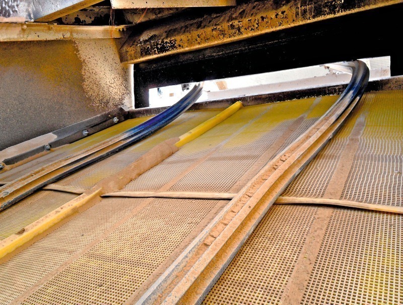 In order to test the pneumatic screen cleaning striking arm system two striking arms were attached, due to the width of the screener. The already existing protective screens were kept on the top screening deck (made of double corrugated steel with 13 x 13 mm mesh openings), as this deck was working without any problems. High-performance INE‑FLOW® screens made of INAPRENE® polyurethane and with 7 x 7 mm square mesh openings were installed on the bottom screening deck. When it became evident that these screens were not the least bit plugged, the size was reduced at the request of the company. Currently, two screens with 5 x 5 mm openings and three screens with 4 x 4 mm openings are used, ensuring that the mesh openings are always open. It has even been possible to grade this type of aggregate, considered difficult to screen with a conventional screener, using screens with 4 x 4 mm mesh openings.