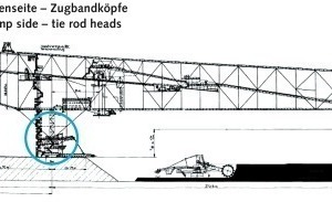 On the basis of comprehensive structural analyses made during the last years, TAKRAF proposes to replace the large equalizer, roller table, ball and socket joint with a diameter of 1250 mm and vertical rail of the overburden conveyor bridge. Another aspect of the proposed modernization program is the replacement of the tie rod heads (Fig.).