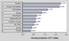 The TOP 10 producers have a production figure of 8.562 Mta, which is 53 % of the worldwide copper production from ore processing plants (Fig. 15, data for 2011). The market leader is Codelco (Corporacion Nacional del Cobre de Chile) with a production of 1.734 Mta or 10.8 % global market share. The company is 100 % state-owned. In 2011 Codelco’s copper came from six mines: Chuquicamata, Radomiro Tomic, El Teniente (Fig. 16), Andina, Gabriela Mistral and Salvador, which are all located in Chile. The 2nd place in the rankings, not far behind Codelco, is occupied by Freeport McMoRan (FCX) with a copper production of 1.678 Mta and a market share of 10.5 %. FCX is a global player and owns copper mines in North and South America, Africa (DR Congo) and Indonesia. 55 % of the company’s copper production in 2011 came from the three mines Grasberg (Indonesia), Morenci (USA) and Cerro Verde (Peru). BHP Billiton is in 3rd place with a production rate of 1.139 Mta and a market share of 7.1 %.