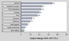 The subsequent rankings with market shares of around 5 % and less are held by Xstrata (5.4 %), Antofagasta (4.0 %), Anglo American and Southern Copper (3.7 % each), Rio Tinto (3.2 %), KGHM Polska Miedz (2.7 %) and Norilsk Nickel (2.3 %) and Glencore International, who also have a production rate of 0.363 Mta and a 2.7 % market share. However, the market is characterized by a high degree of variation in the annual ranking list. For example, Southern Copper and Antofagasta proved to be winners in the recent past. Southern Copper increased its copper production of 0,485 Mta by 0,102 Mta from 2009 to 2011 while Antofagasta raised its output of 0,443 Mta by 0,198 Mta or almost 45 % in the same period of time. By contrast, Anglo American and Rio Tinto were not able to maintain their 2009 production figures. Anglo American’s output dwindled from 0.678 Mta by 0.158 Mta, representing a decrease of 23 % up to 2011.