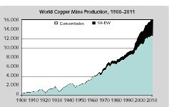 Demand for copper is currently higher than supply. As a consequence, mine production rates are also increasing. Around the year 1900 the total output was only 0.5 Mta, but since then the mine production figure has risen to over 16.0 Mta. In recent years, an increasing discrepancy between production rates and mine capacities has been noticeable (Fig. 5). Owing to the stronger growth of capacity, the capacity utilization dropped from 85.7 % to 79.0 % between 2007 and 2011. A further aspect is that copper resources are becoming scarcer, so that deposits of lower-quality ore have to be mined (Fig. 6). The average content of copper in the process feed fell by about 25 % from around 0.9 % in 1980s and 1990s to 0.65-0.7 % in the space of just a few years. It is anticipated that by 2015 the average content of copper in ores will be only 0.6 %. As a result, exploration costs will generally be considerably higher than they are at present.