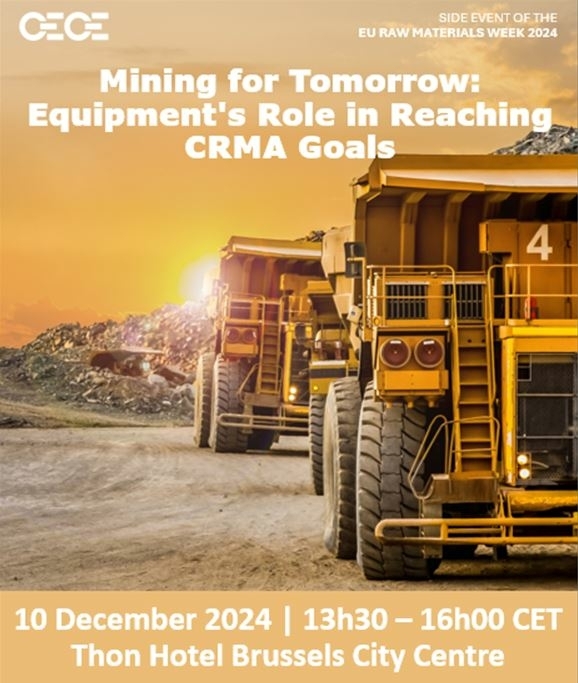 28.11.2024CECE announced its event Mining for Tomorrow: Equipment's Role in Reaching CRMA Goals, which will be hosted on 10th December, 2024 at the Thon Hotel Brussels Center in Brussels/Belgium. The event is an official side event of the EU Raw Materials Week 2024. Open to all, it will be taking place from 13:30 – 16:00 CET with a welcome coffee from 13:30-14:00.