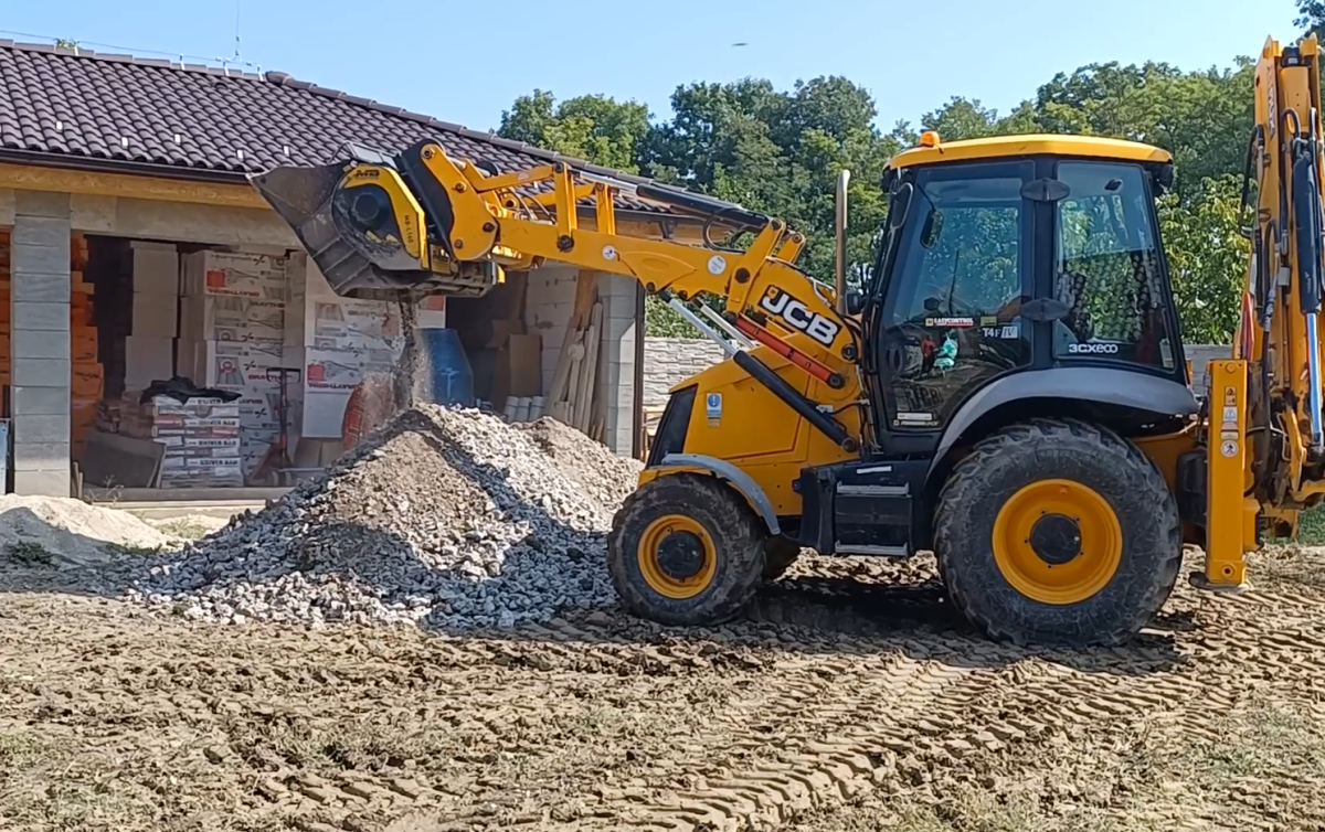 In Slovakia, the concrete yard was taken up and crushed down to create the subbase for the new layer, all done at the site with the JCB 3CX loader and the MB-L160 crusher bucket. The old cement did not leave the site and became a resource instead or waste.