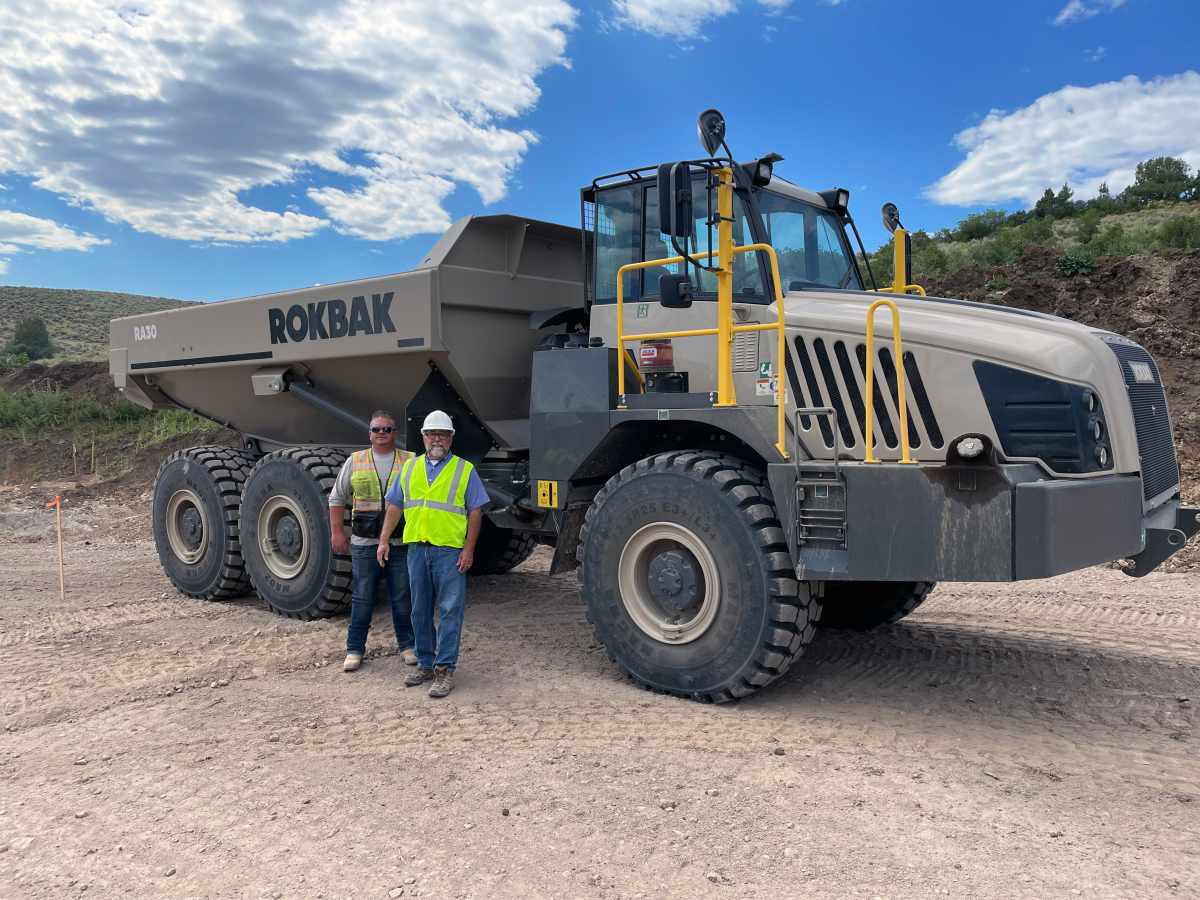 Jarrett Lindgren, superintendent for Mark 25 Homes, and Randy Gallegos, president of Rasmussen Equipment, in front of a Rokbak RA30 truck